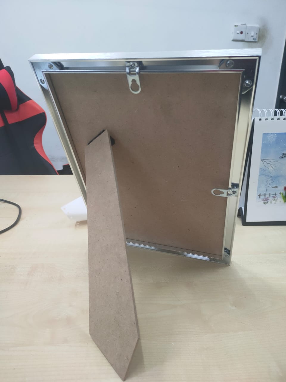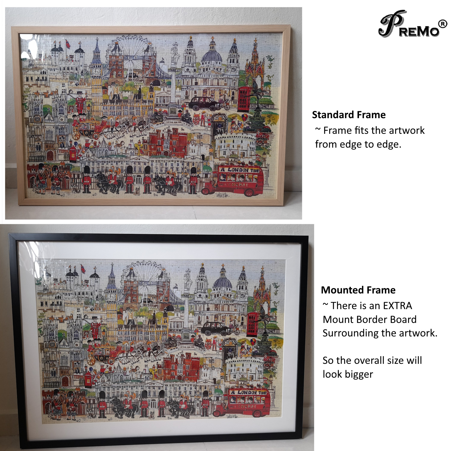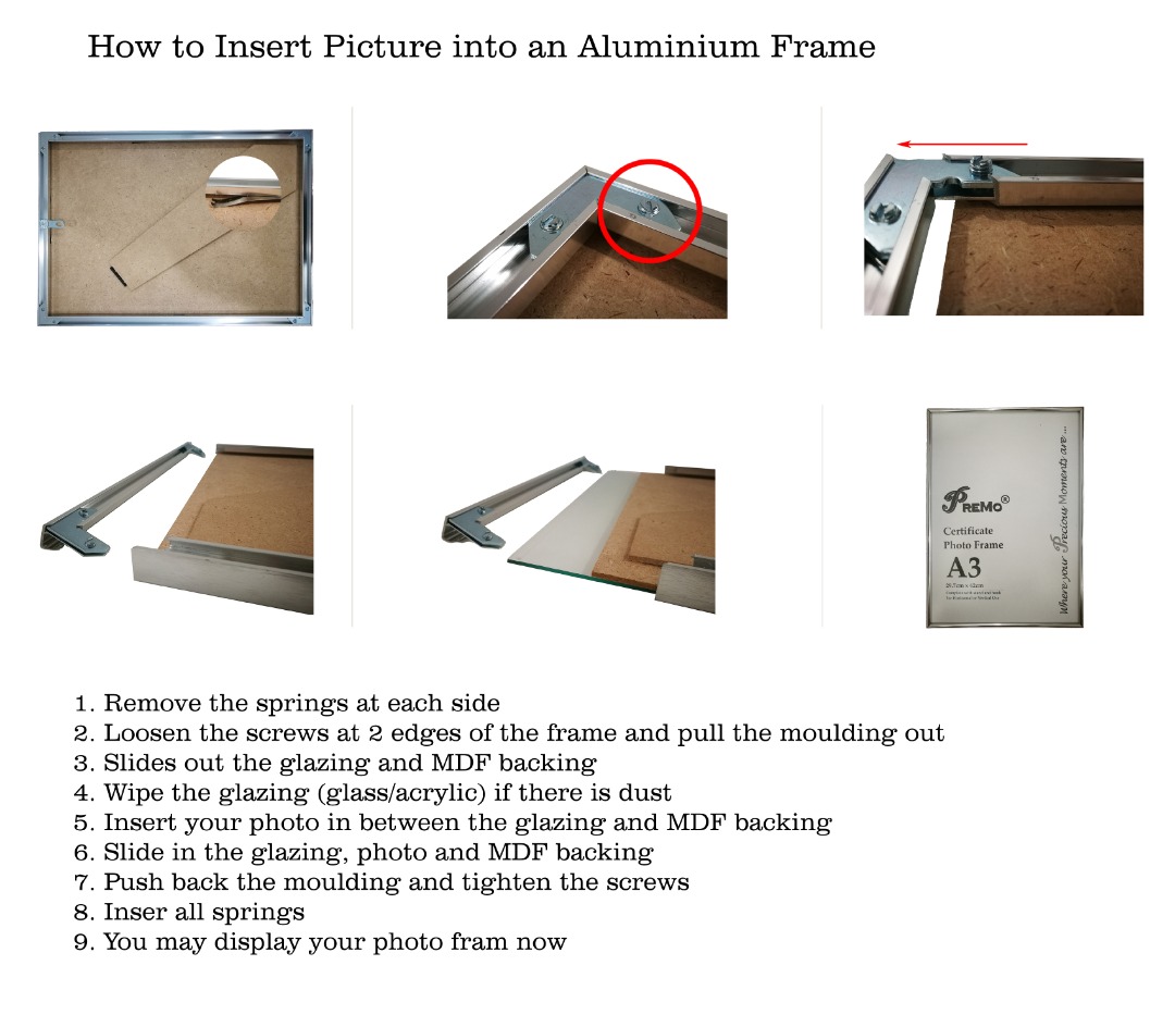 Aluminum Framed for Photographs / Posters / Puzzle Material: Aluminum Width : 1cm Thickness : 1.5cm Front cover with 1.5mm acrylic Standard frame = frame fitting photo from edge to edge ; Mounted frame = extra cardboard surrounding the photo , so overall size become bigger. Content Size: A4 / A3 / A2 Customization available .